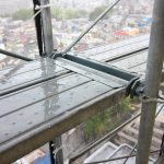 雨や湿気は、足場の金属部分を腐食させるだけでなく、滑りやすい足場の表面が作業員の転倒リスクを高める要因となります。降雨によって溜まった水は、足場の劣化を早めるため、日常的な点検とメンテナンスが必要です。